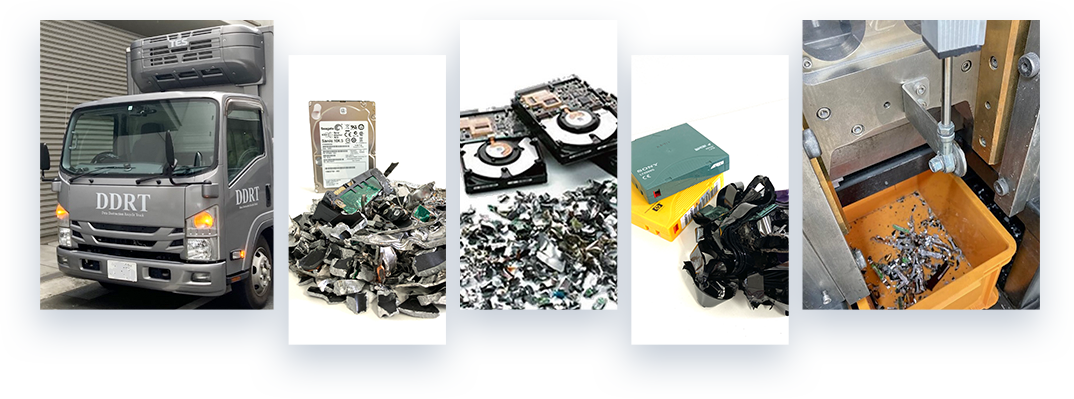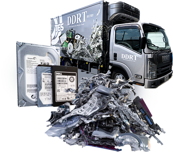 昨今様々なデータ破壊の手法が存在します。データ消去ソフトによる消去、HDD等の記憶パーツであるプラッター部分の穿孔による破壊、強磁気放射による破壊等がありますが、TESのサービスは記録メディア自体を2-40mmの任意の幅で粉々に破砕し、完全にデータの復元が出来ない状態にします。破砕機能を備えた専用車両・DDRT(Data Destruction Recycling Truck)にて専門エンジニアがお客様のもとに出張し、お客様の立ち合いのもと確実に破砕作業を実行致します。